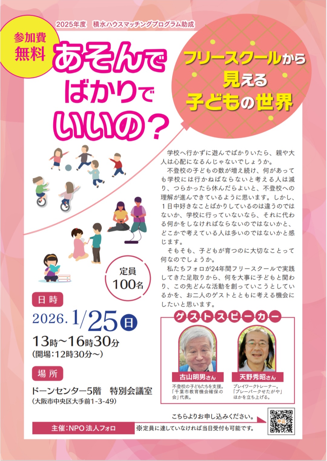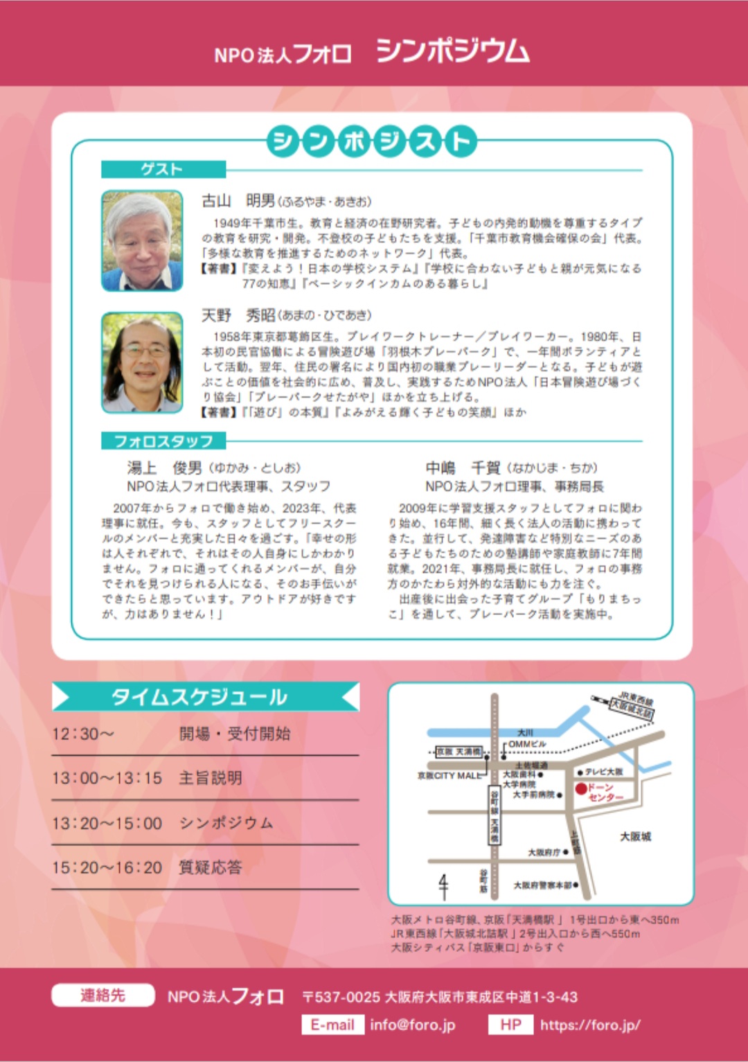 私たちフォロが24年間フリースクールで実践してきた足取りから、何を大事に子どもと関わり、この先どんな活動を創っていこうとしているかを、お二人のゲストとともに考える機会にしたいと思います。
